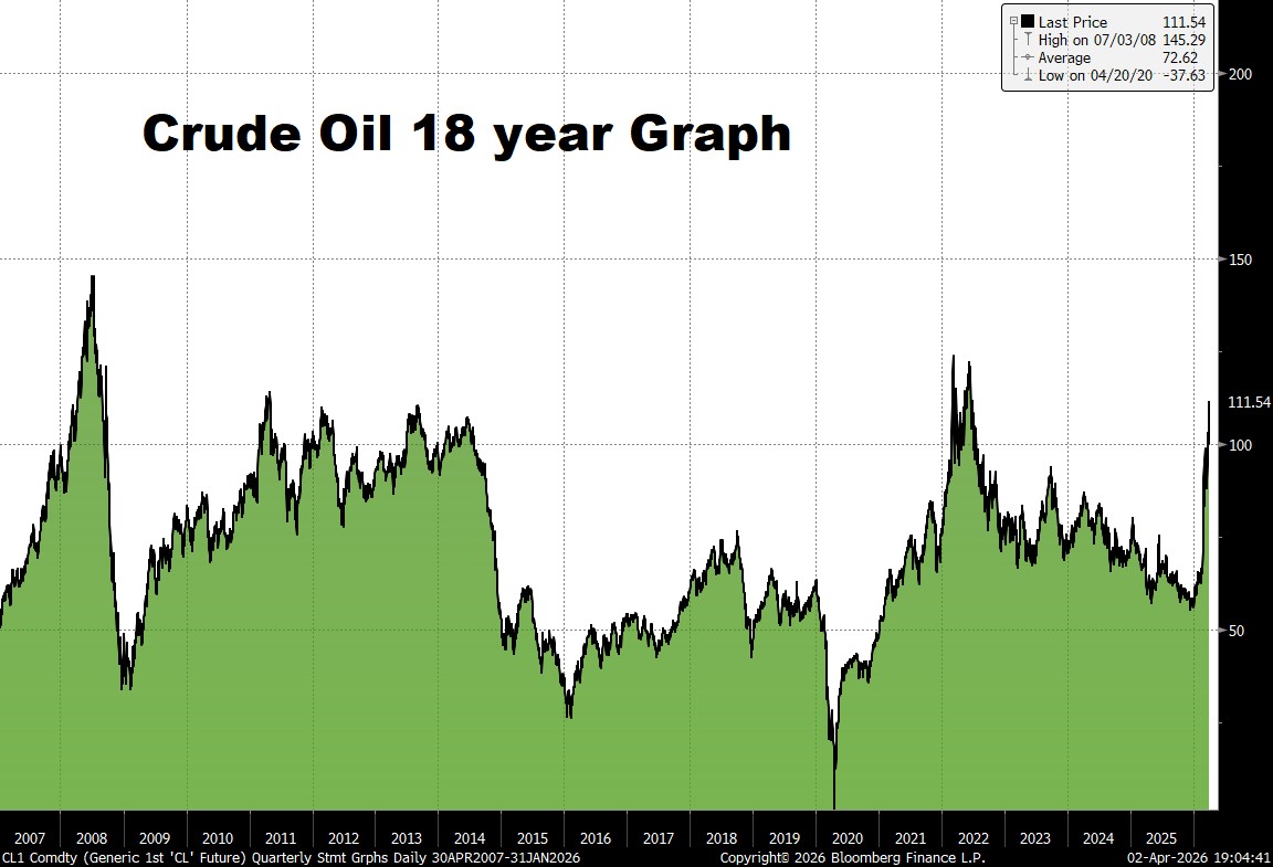 The US economy continues to grow despite geopolitical events and the shock of oil surging over $100 per barrel. The US economy has been in growth mode since the 2020 Covid led recession. Economists and market strategists have continued to expect a recession but without visible rot in the economy and with an abundance of jobs and steady improvement in personal income, the economy stays on course. The first quarter was full of changing expectations for inflation, interest rates, and growth. At the beginning of the quarter economists thought sure a recession would emerge, but by mid-quarter those fears had diminished as strong employment and steady consumption continued in America. By the end of the quarter war with Iran had begun and the price of oil suddenly surged over $100 a barrel. (Figure 1). The straight of Hormuz was closed and the extent of the closure has created vast uncertainty about the price of oil and inflationary fears surged again. As a result, interest rates on treasuries rose over 50 basis points from 3.70 to 4.40 for the 10 year treasury. Equity investors at first shrugged her shoulders about a possible recession but by the end of the quarter investors began to sell stocks and markets were down with most equities losing 4 to 8% and bonds declining 1 to 2% during the quarter. MACM’s dynamic growth portfolio lost 2.7%. The markets suffered their first quarterly loss since the first quarter of 2025. Consumer confidence was surprisingly strong even as the war grew more intense and Trump threatened to obliterate Iran and return it to the Stone Age.